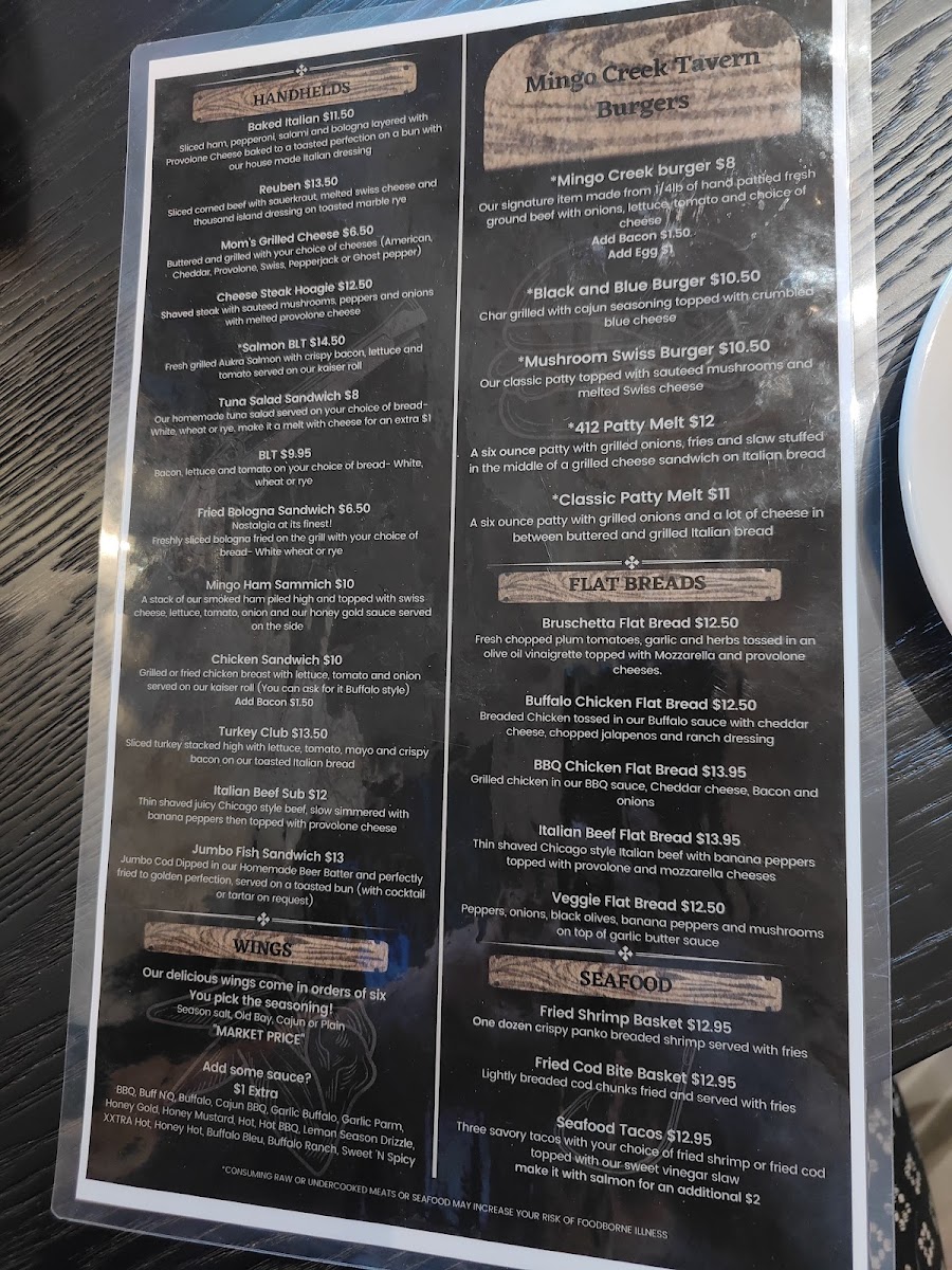 Introducing the menu at Mingo Creek Tavern, a gem located at 2698 PA-136, Eighty Four, PA, showcases a delightful blend of classic comfort food and unique flavors. Their offerings are diverse, featuring salads like the refreshing Chicken Salad for $14 and the simple yet satisfying House Salad for $5.50. Seafood lovers can indulge in crispy Fried Shrimp Baskets or savory Seafood Tacos, both priced at $12.95.